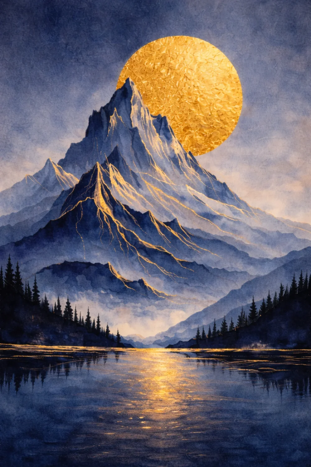 By the end of this module, your Midnight Mountain scene is fully painted and ready for gold — clean depth, misty atmosphere, and a reflection that looks intentional (not fussy).